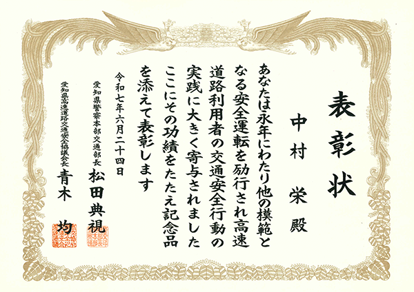 愛知県高速道路交通安全協議会から表彰状を受賞
